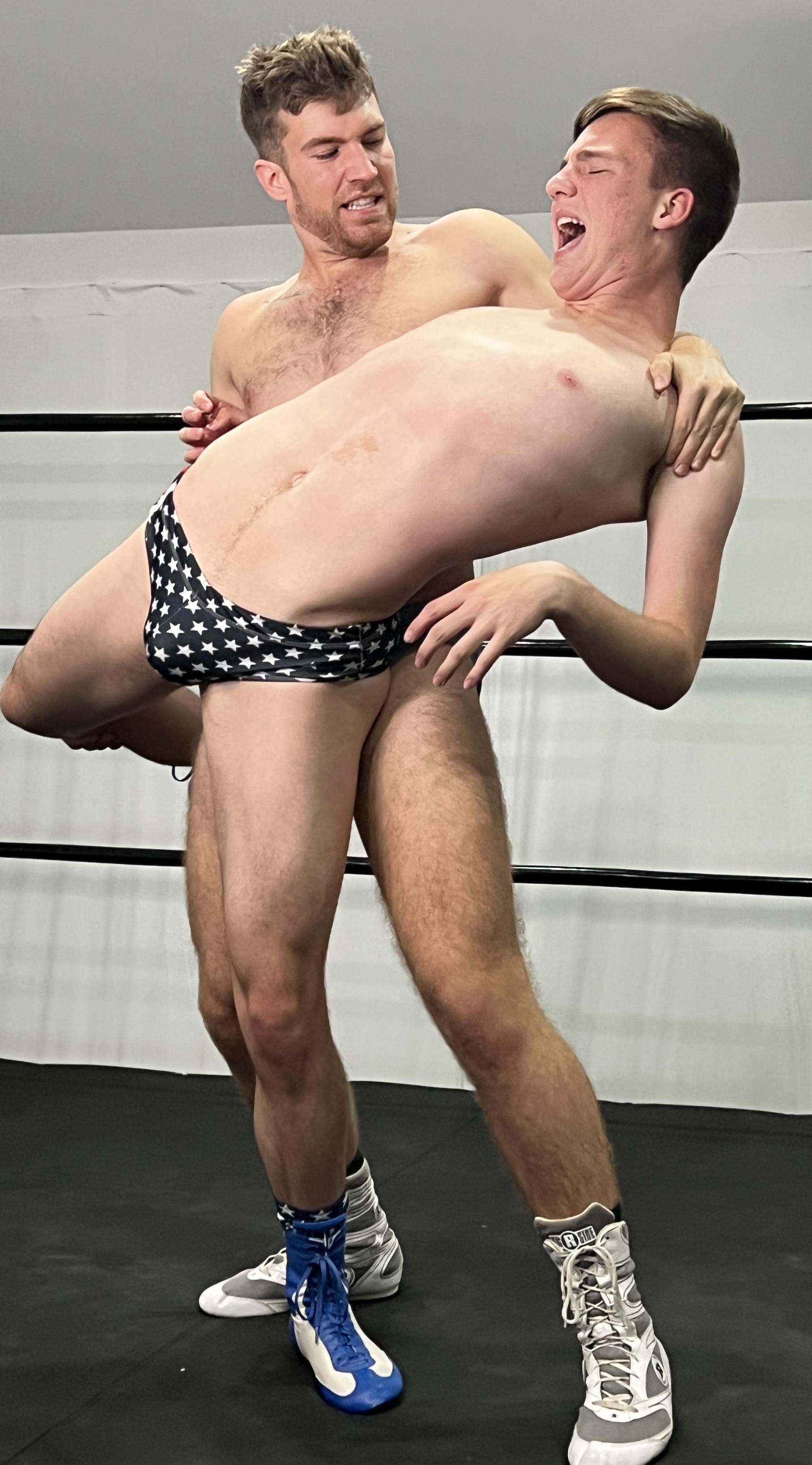 Carter does not suffer punks very much and Zac is a fucking PUNK. He’s all attitude and Carter is way too gorgeous and skilled to put up with any of Zac’s bullshit. Carter did some scouting before the match so he knew Zac is bendy as fuck. The subtitle of this match should be “ball busting and bend him till he breaks”. Carter racks and stretches and cranks Zac’s back so much that we began to wonder if we should call in a chiropractor. Zac is a mouthy twink who thinks he knows everything and Carter is just hankering to put this punk in his place. And so it goes! Carter takes him apart all over the ring and then stuffs his mouth with his cock over and over. Later Zac’s trunks are stuffed into his pie hole (to shut him the fuck up) and then Carter plugs his other whole with his perfect long and thick cock! Twinks need to be stuffed and pounded like the holiday turkey and Carter and Zac show you exactly what a delicious meal it will be!!