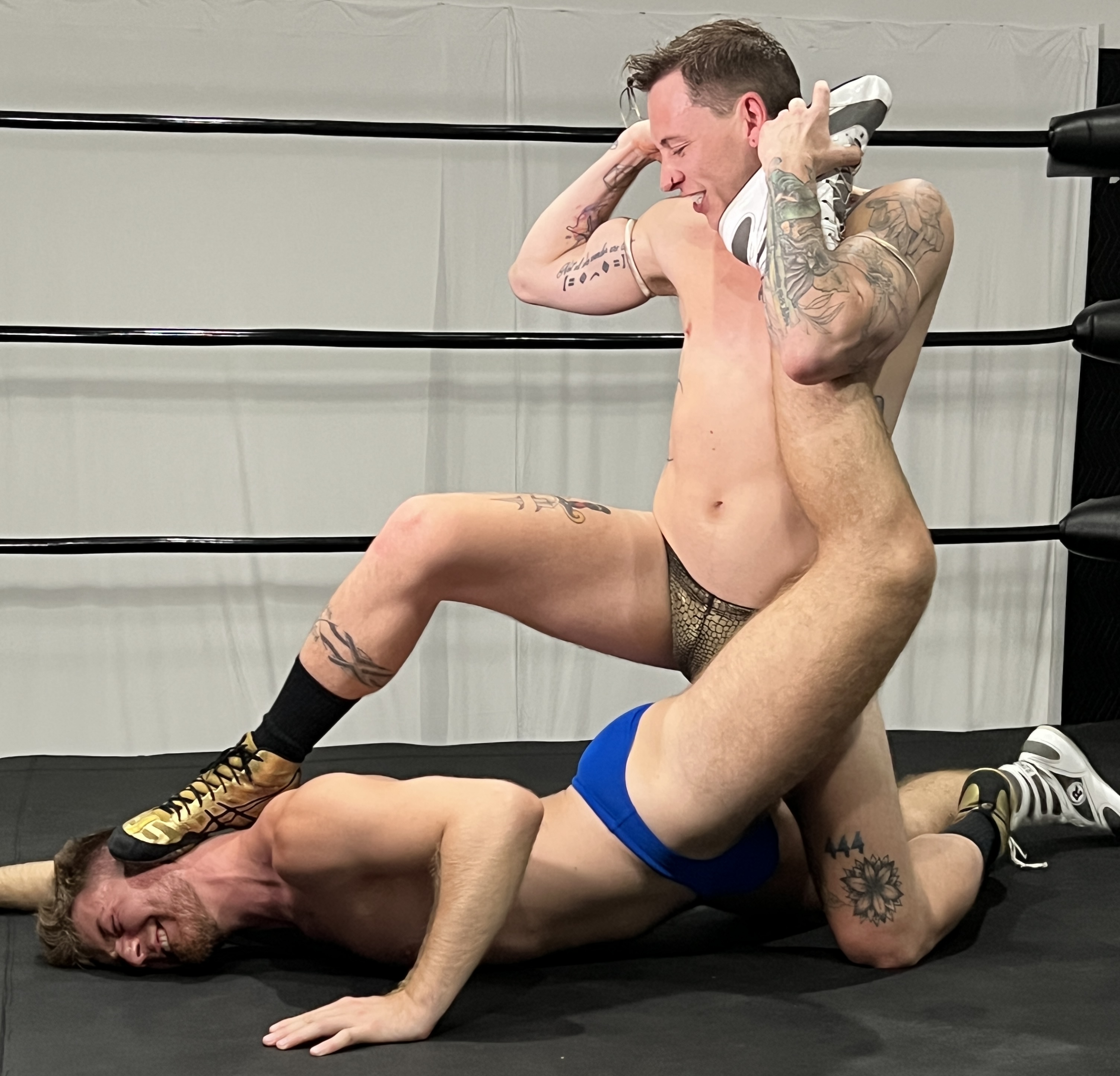 This marquee match up between 2 of MBW’s favorite stars is a sweaty and smashing success. Rarely have we seen 2 wrestlers put on a rough and tumble pro wrestling clinic while also nailing the erotic zone too. This video is just under 1 hour long and every inch of the MBW ring is used to it’s full potential. Bodyslams, turnbuckle work, ball grabs, wedgies, and especially the thunderingly rough submission holds make this one for the history books. And these 2 took our “Bang-Bang” catalog title to heart. The go rough and fast on each other until the canvas is dripping with sweat. Carter is the sexiest heel on the planet and he bangs Aiden all over the ring including fucking him in the center of the ring (among other places). Then for extra kinky fun he ties him up and handcuffs him while plowing his smooth ass as he’s wrapped up in the ring ropes! The sweat and screams pouring out of Aiden face in our free video trailer is the REAL deal! And so is the fucking and the spray of cum that lands everywhere you’d want it to be.